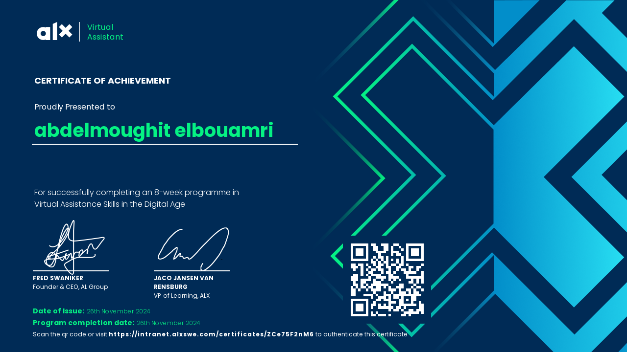 Obtenir mon certificat d'assistant virtuel auprès de la Fondation ALX m'a permis d'acquérir des compétences essentielles telles que la communication, l'organisation et la gestion du temps. Cette certification marque le début de mon parcours professionnel, et je suis enthousiaste à l'idée de l'utiliser pour acquérir de l'expérience, aider des clients et développer davantage ma carrière.