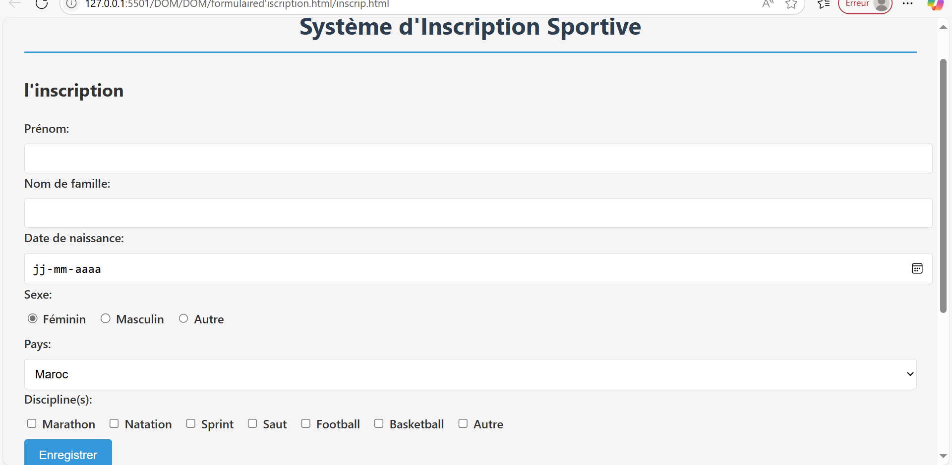 Le formulaire propose une interface simple et intuitive pour saisir les données personnelles (prénom, sexe, date de naissance, disciplines sportives choisies...).