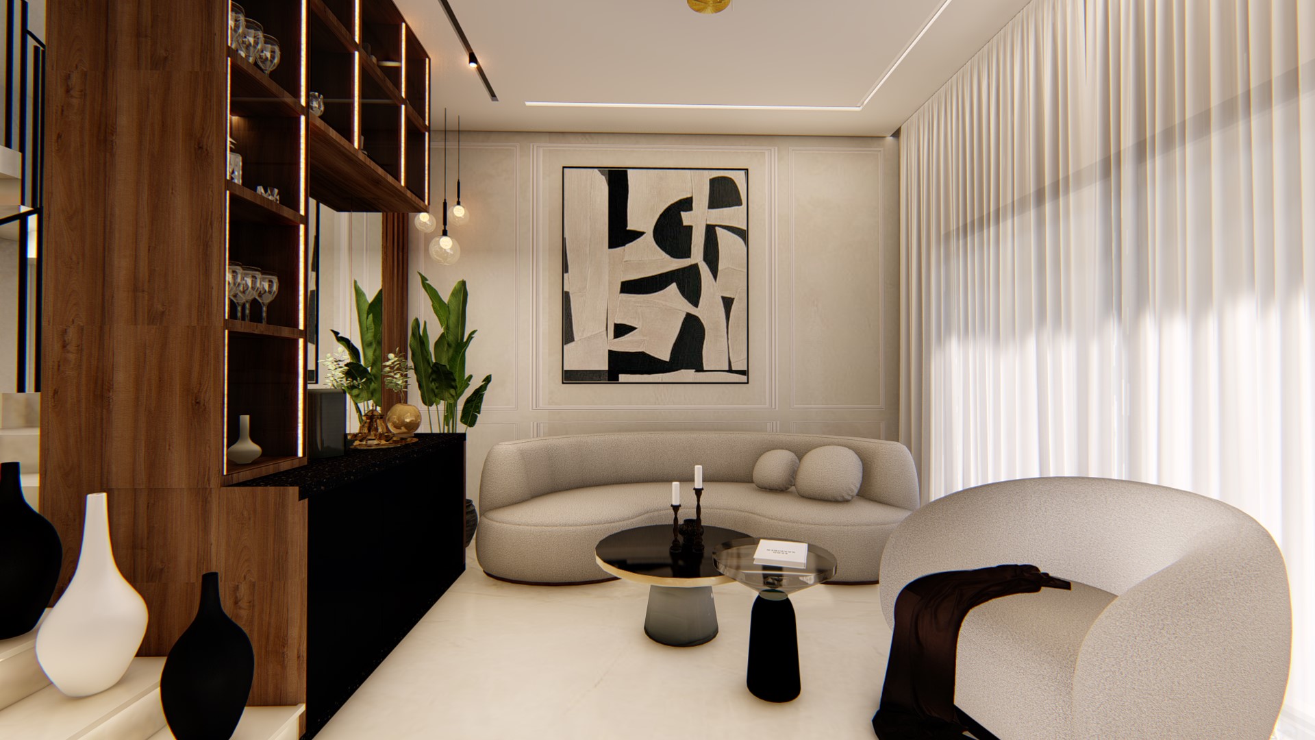 Espace salon lumineux et minimaliste, sublimé par un canapé courbe et une composition artistique en noir et blanc. Les matières douces, les voilages fluides et les luminaires suspendus créent une ambiance chaleureuse et sophistiquée, équilibrée par une touche de bois naturel et des lignes épurées.