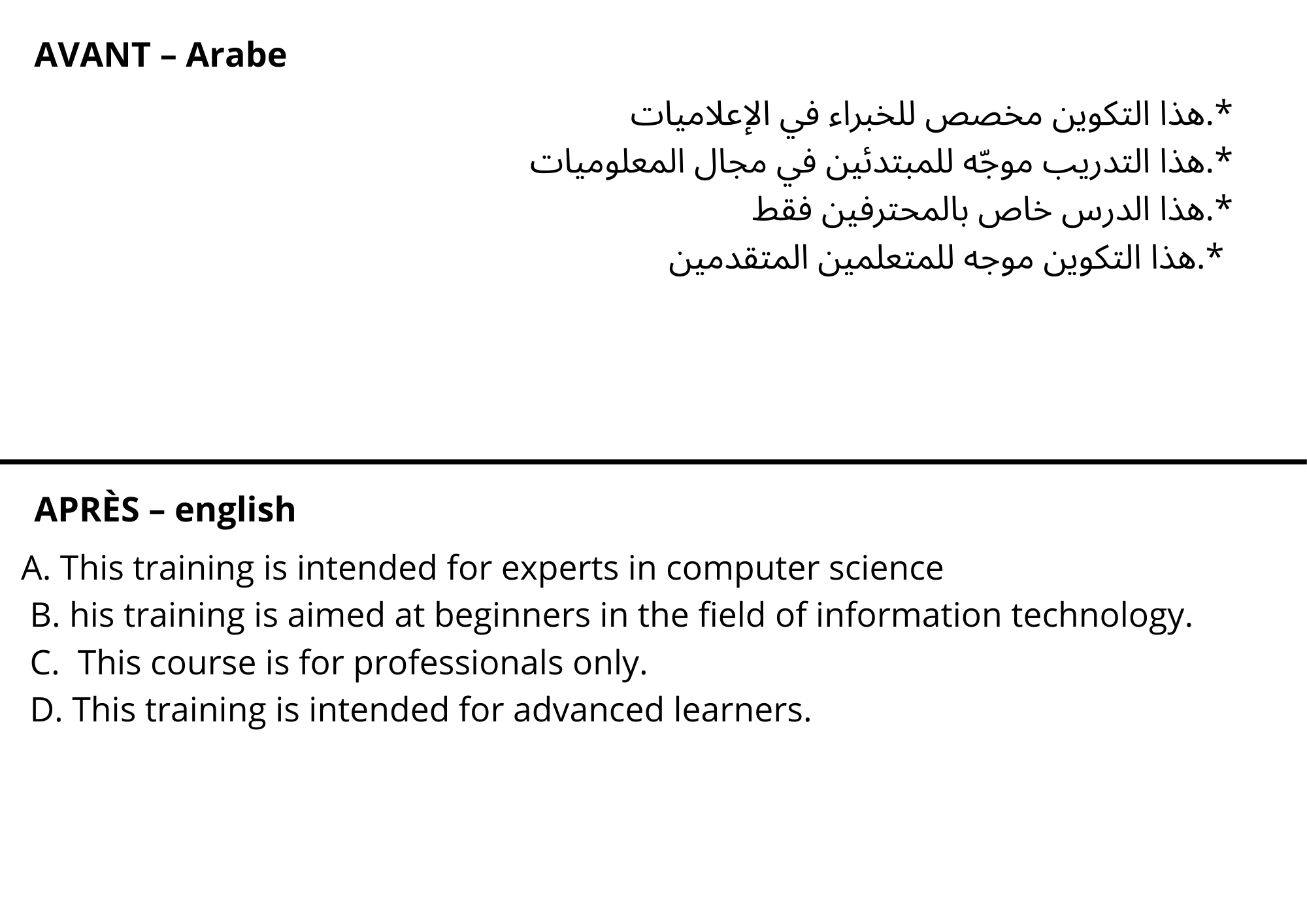 Respect du sens, vocabulaire adapté et langage clair pour tous niveaux.