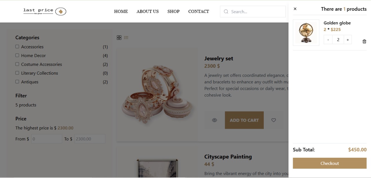 Gestion de panier : Possibilité d'ajouter des produits au panier pour un achat ultérieur,Paiements sécurisés : Intégration de Stripe pour des paiements sécurisés, garantissant une expérience client fiable et sans souci.