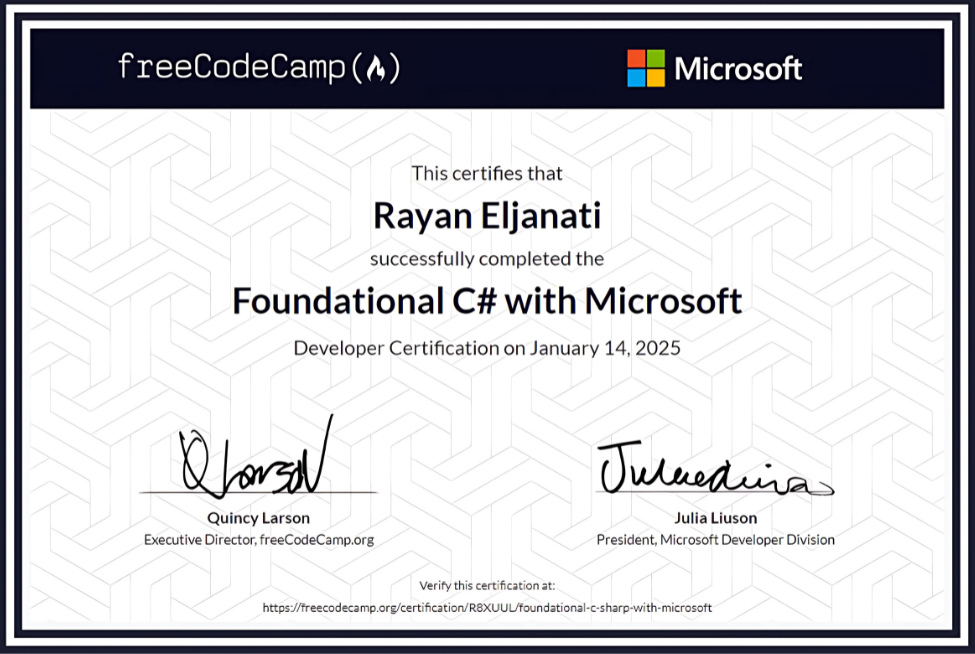Ce certificat atteste que Rayan Eljanati a réussi la formation C# de base avec la certification du développeur Microsoft. Ce programme m’a permis d’acquérir les compétences nécessaires pour développer des applications, écrire du code efficace et appliquer les principes de la programmation orientée objet.