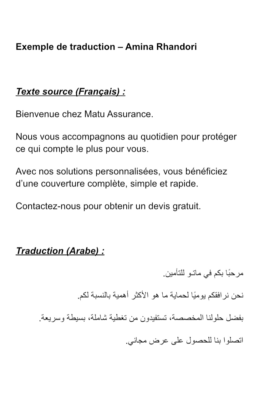“Exemple de traduction professionnelle d’un texte français vers l’arabe. Cette traduction a été réalisée pour un document de présentation d’entreprise dans le secteur de l’assurance. Le texte met en avant l’engagement de l’entreprise à offrir des solutions de couverture complètes, simples et rapides. Le travail inclut une traduction précise et fluide, respectant le ton et le style professionnel du texte original. Cette réalisation démontre ma capacité à traduire efficacement des documents dans des contextes formels et commerciaux.