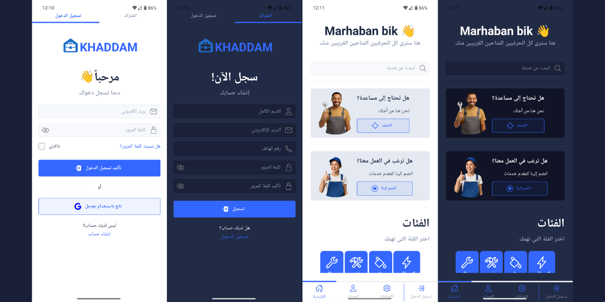 KHADDAM est une application mobile qui met en relation les utilisateurs avec des prestataires de services qualifiés à proximité, tels que des plombiers, des électriciens, des peintres, etc. L'application utilise React Native, Node.js, Express, PostgreSQL et UI Kitten pour l'interface utilisateur. Ce projet m'a permis de renforcer mes compétences en développement mobile, en authentification sécurisée avec JWT et en intégration d'API RESTful.